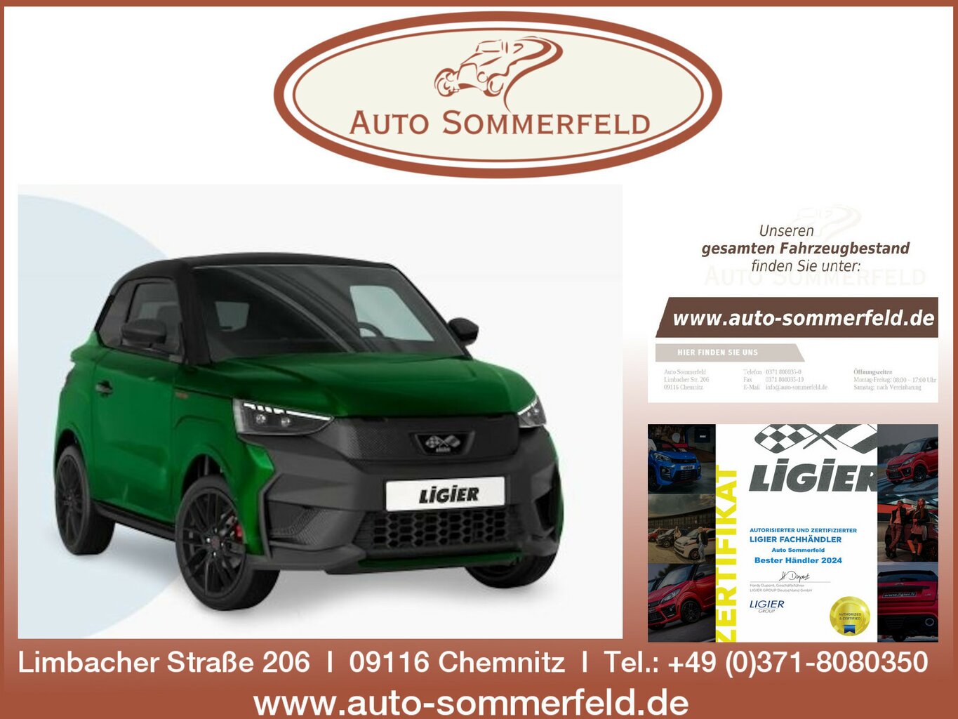 Willkommen bei Auto Sommerfeld- Ihrem Ligier Experten für Neu- und Gebrauchtwagen!Modern.Mobil.Meisterhaft. Erleben Sie die neue Freiheit mit einem Ligier- dem Spitzenreiter unter den Leichtkraftfahrzeugen. Ob als stylische City-Flitzer oder kompfortable Pendlerlösung- Ligier steht für Qualität, Sic ... |